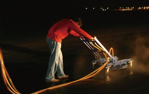 機(jī)場跑道因飛機(jī)起落,輪子與道面的急劇摩擦使橡膠粘在道面上,久而久之,粗糙的道面就變得很光滑,這樣飛機(jī)就容易滑出跑道。定期除膠保證道面摩擦系數(shù)大于0.5,所采用的就是超高壓水射流技術(shù),其基本要求就是既要除去橡膠,又要不傷跑道。以往采用人工刷洗和化學(xué)清洗的方法,但效果并不理想成本高、易污染,不適應(yīng)瀝青道面等缺點。國內(nèi)外機(jī)場都在普遍應(yīng)用水射流進(jìn)行除膠作業(yè)。漢諾所提供的高壓泵機(jī)組配合清洗手推車可以高效地解決以上問題。