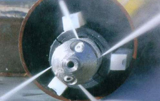 漢諾為用戶提供專門用途的高壓泵機組,機組提供的高壓水經(jīng)高壓膠管送至噴頭,沖擊管壁銹垢。由于管道埋設(shè)于地下,在管內(nèi)人工移動噴頭難度較大。因此,要求射流能均勻沖洗管道內(nèi)壁,并產(chǎn)生向前的推力,使噴頭和膠管自動前移。根據(jù)流體動量定律,若噴頭以一定角度向斜后方射流,既能產(chǎn)生對管壁的沖擊力,又可保證對噴頭和膠管的推力。