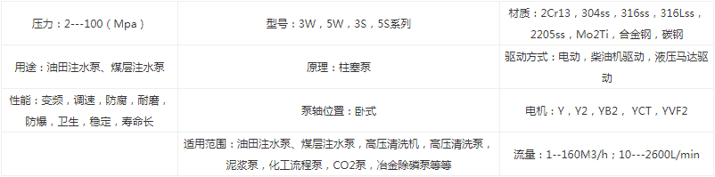 適用范圍: 油田及礦場注水泵、超高壓泵、噴射泵,除鱗泵、高壓清洗泵,加濕泵,噴霧泵,流程泵、稠漿泵、泥漿泵、液態(tài)二氧化碳泵、洗滌劑料漿泵、化工泵、液壓泵、輸油泵,海水泵等專業(yè)用泵。 特 點(diǎn): 該泵吸收國內(nèi)泵業(yè)之精華,設(shè)計(jì)先進(jìn)、結(jié)構(gòu)緊湊、體積小、泵效高、運(yùn)行平穩(wěn)、安全可靠、操作簡便、產(chǎn)品制作精良、外形美觀。每個(gè)品種的泵都有安全調(diào)壓閥,泵壓可以任意調(diào)節(jié),并有油溫、壓力、自動保護(hù)。 結(jié)構(gòu)型式:固定式、移動式 泵體結(jié)構(gòu):臥式、立式 傳動型式:電機(jī)或柴油機(jī),變速型式:皮帶、齒輪、電磁調(diào)速、變頻速、 主要零部件:機(jī)座(材料HT250);泵體(材料:316、1Cr18Ni9Ti、2Cr13、 碳鋼化鍍鎳-磷合金防腐層)經(jīng)熱處理,避免疲勞破裂;曲軸(材料:35CrMo、42CrMo)經(jīng)調(diào)質(zhì)硬氮化處理、強(qiáng)度大、硬度高、耐磨耐用;柱塞(材料:超性陶瓷、噴焊鎳合金Ni60耐磨耐腐層);盤根密封(采用進(jìn)口芳綸或碳素纖維)。 閥組型式:錐閥、平板閥、組合閥等。經(jīng)特殊處理,耐磨耐用。